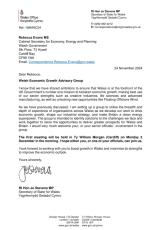 Copi o ohebiaeth ynghylch y Grŵp Cynghori ar yr Economi a sefydlwyd gan yr Ysgrifennydd Gwladol.