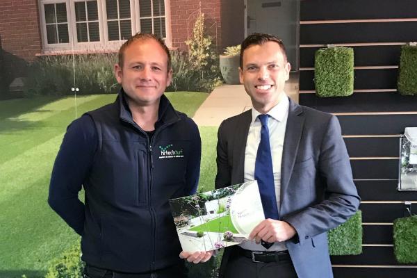"Gwych yw gweld busnesau fel Hi Tech Turf yn llwyddo ac ehangu. Maent yn darparu cynnyrch rhagorol ac mae'n wych clywed eu bod wedi bod yn rhan o brosiectau mor amrywiol â Surf Snowdonia a'r South Bank yn Llundain.