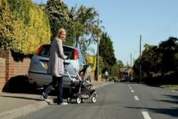 Llun o berson yn gwthio bygi babanod i'r ffordd wrth i gar barcio ar balmant