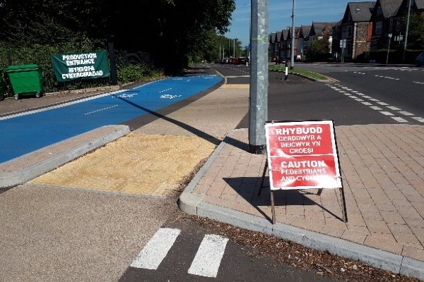 Llun o lonydd cerddwyr a beiciau ar wahân ochr yn ochr ac arwydd rhybudd