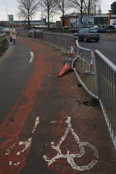 Llun o lôn feicio wedi'i difrodi a rhwystr sydd wedi'i ddifrodi