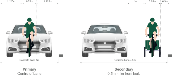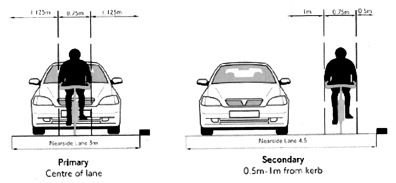 20.6 Bydd lled y lonydd yn pennu a fydd y beiciwr yn symud ymlaen yn y prif safle ar y ffordd neu'r safle eilaidd ar y ffordd. Yn y prif safle ar y ffordd, mae'r beiciwr yn beicio yng nghanol y lôn ynghanol y llif traffig. Rhaid gwneud hyn yn achos lonydd sy'n 3m o led neu'n llai. Yn y safle eilaidd ar y ffordd, mae'r beicwyr yn beicio 0.5m i 1.0m i ffwrdd o ymyl y gerbytffordd ac mae digon o le i gerbydau oddiweddyd. Mae modd gwneud hyn yn achos lonydd sy'n fwy na 4.0m o led. Ni ddylid gosod mesurau rheoli traffig â lonydd rhwng 3.2m a 3.9m o led gan y bydd gyrwyr yn cael eu temtio i basio beicwyr heb roi digon o le iddynt.  Mewn achosion o'r fath, dylid defnyddio arwyddion i'w gwneud yn glir na chaniateir goddiweddyd beicwyr.