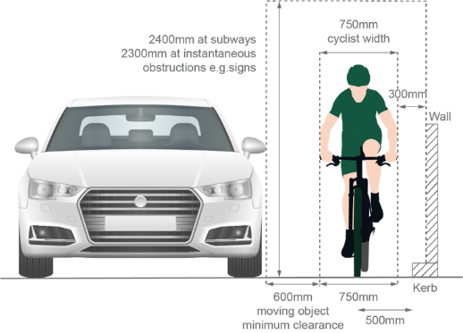 20.11 Dylai'r hyrwyddwr gwaith ystyried y lle sydd ei angen ar feicwyr gan fod rhwystrau ffisegol ar uchder pedalau a chyrn beic er enghraifft yn gallu bod yn arbennig o beryglus. Dylid darparu mwy o led er mwyn rhoi digon o le i osgoi'r rhain. Caiff gwybodaeth fanwl am y lle sydd ei angen ar feicwyr ei nodi yn 12.17, 12.18 a 12.19 o ganllawiau'r Ddeddf Teithio Llesol.