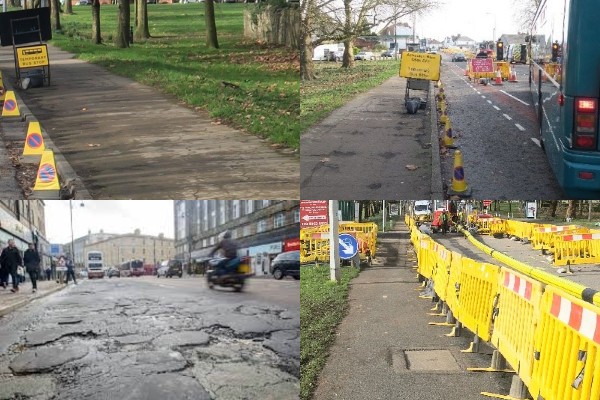 Clocwedd. 1: arwyddion ffyrdd ar droedffordd gyhoeddus. 2: safle bws dros dro gada arwyddion a bolardiau ar neu yn nhroedle'r ffordd. 3: arwyneb ffordd gwael. 4: gwaith cloddio yn digwydd wrth ymyl y ffordd, gan gulhau'r palmant.