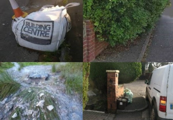 Clocwedd. Bag o dywod ar ochr y ffordd 2. gorhongian llwyni heb eu cadw ar balmant 3. dŵr yn gollwng i briffordd gyhoeddus 4. palmant preswyl. Mae sbwriel ar y palmant ac mae fan wedi'i barcio i gyfyngu'r lle i sgwter symudedd, cadair olwyn neu fygi fynd heibio.