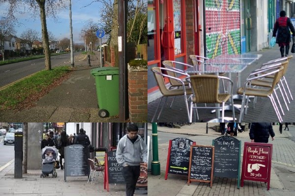 Clocwedd. 1: Bin sbwriel yn rhwystro palmant. 2: Byrddau a chadeiriau y tu allan i gaffi ar briffordd gyhoeddus. 3: Llwybrau troed wedi'u annibendod ag arwyddion. 4: Llun o arwyddion yn rhwystro llwybrau cyhoeddus.