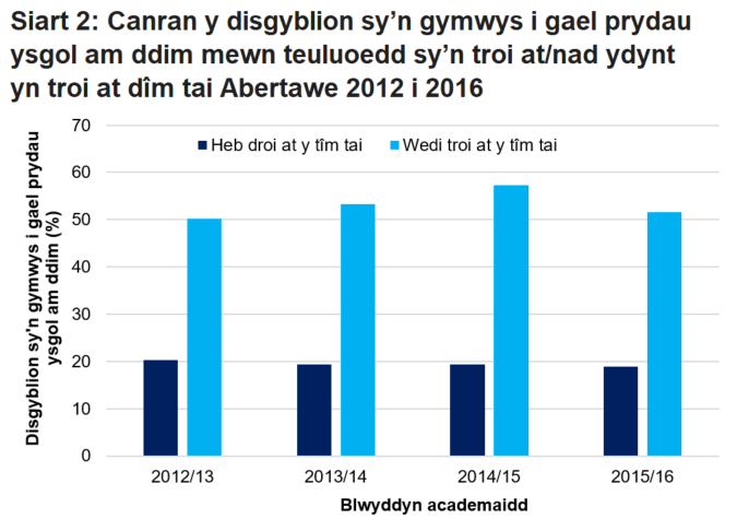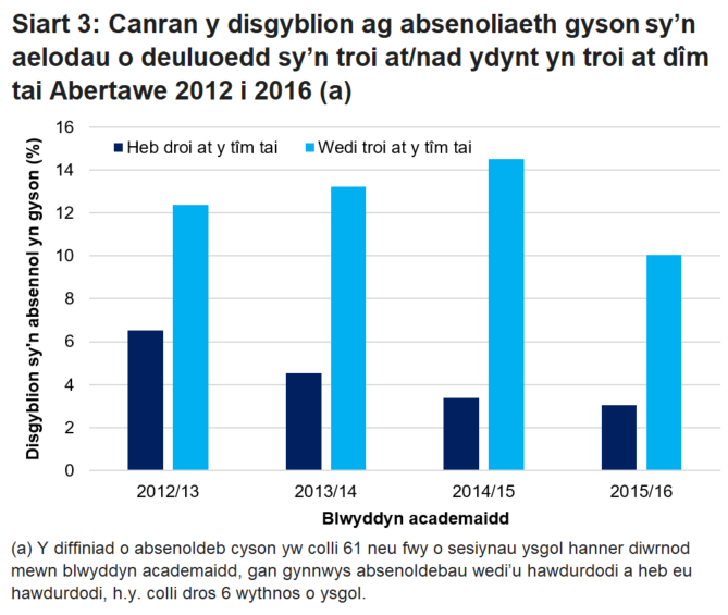 Roedd gan blant o deuluoedd yr oedd angen cymorth tai arnynt lefelau uwch o absenoliaeth gyson o’r ysgol. Yn ystod blynyddoedd academaidd 2012 i 2016, roedd rhwng 12% a rhyw 14% o ddisgyblion a oedd yn absennol o’r ysgol yn gyson yn aelod o deulu a drodd at dîm tai Abertawe. Cwympodd hyn i 10% yn 2015 i 2016. Gweler Siart 3.