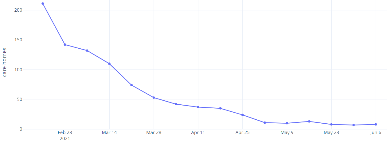 In the 7 days up to 2 June 2021, 4 (0.4%) adult care homes in Wales notified CIW of one or more confirmed cases of COVID-19, in staff or residents. This is 3 fewer notifications compared to the last 7 days up to 26 May 2021. The number of notifications is similar to the lowest levels since the beginning of the reporting period on 16 December 2020.