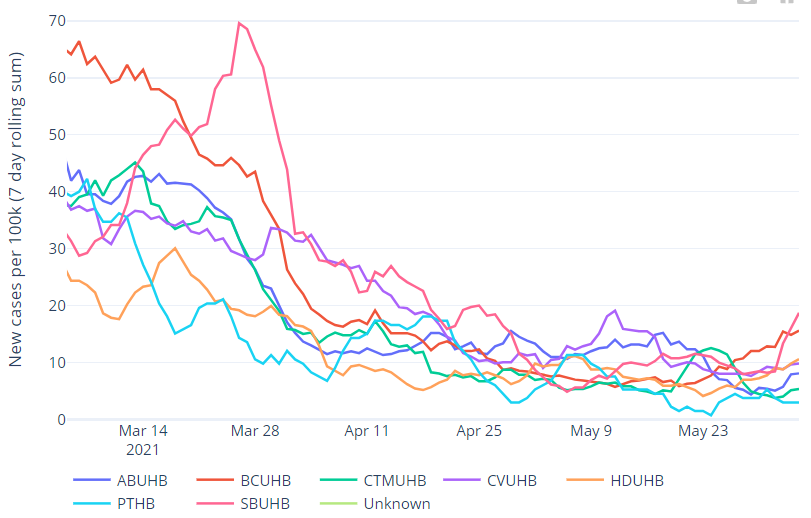 At a Wales level, on 4 June, the 7-day rolling incidence of COVID-19 cases and the percentage of people testing positive for COVID-19 have increased slightly since last week.