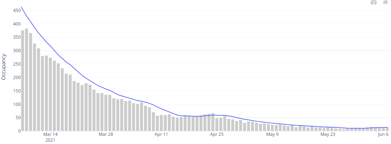 COVID-19 pressure on the NHS has generally stabilised and is now similar to the lowest levels since reporting began. As at 9 June 2021, there were 127 COVID-19 related patients (Suspected, Confirmed and Recovering) occupying a hospital bed. This compares to 131 (4 fewer occupied beds) on 2 June 2021. Confirmed patients accounted for 25 of the total occupied beds, and are at similar levels to mid-May 2021.