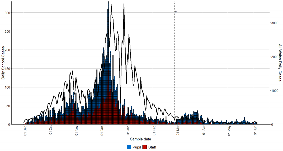 Epidemiological curve of cases in all staff and pupils linked to a school between 01 September 2020 to 7 June for all Wales maintained schools