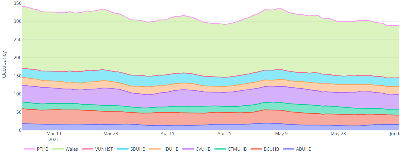 There are 3 patients with Suspected or Confirmed COVID-19 in critical care beds in Wales. This is 161 lower than the maximum COVID-19 position of approximately 164. The total number of patients in critical care for both COVID-19 and non-COVID-19 stands at 154, 2 more than the historic maximum critical care capacity of approximately 152.
