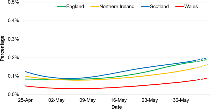 Although positivity rates remain low for all four UK countries, positivity rates have increased in recent weeks. The percentage of people testing positive has increased over the last two weeks in Wales to 0.08%. However, the trend is uncertain in the most recent week.