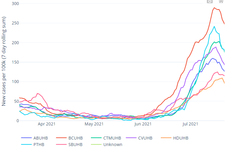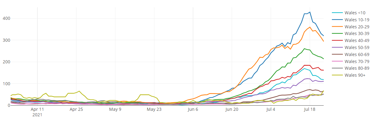 At a Wales level, on 23 July 2021, the 7-day rolling incidence of COVID-19 cases has decreased since last week. The percentage of people testing positive for COVID-19 has remained steady since last week (slide 2).