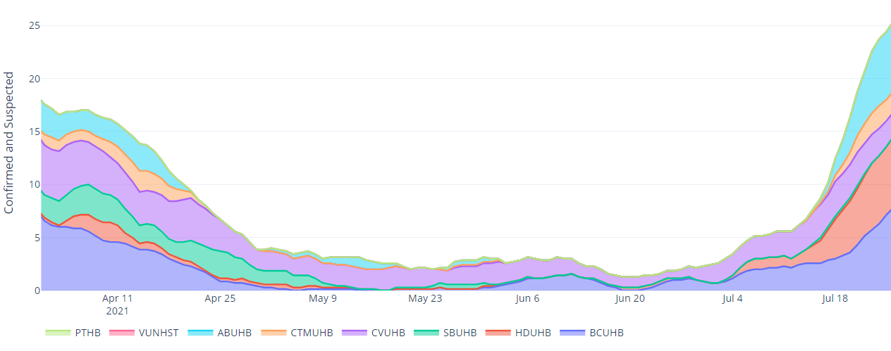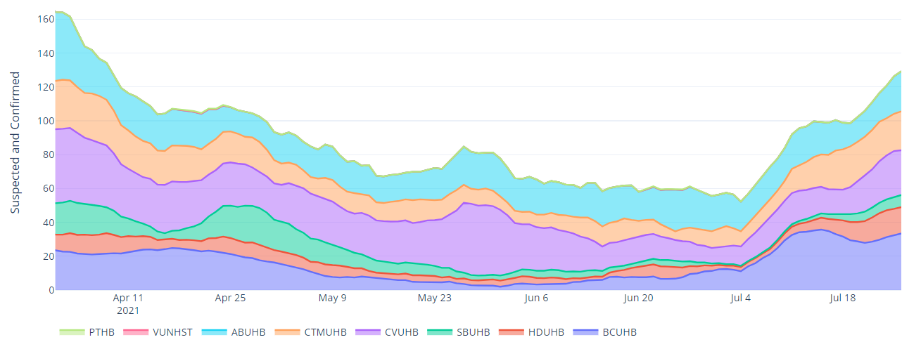 COVID-19 pressure on the NHS has been steadily increasing over recent weeks. As at 28 July 2021, there were 192 COVID-19 related patients (Suspected, Confirmed and Recovering) occupying a hospital bed. This compares to 176 (16 more occupied beds) on 21 July 2021. Confirmed patients accounted for 139 of the total occupied beds, and are at similar levels to late March 2021.