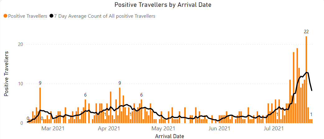 There is a 29% increase in overall travellers. There were 37 positive travellers (0.49% positivity) compared with 76 (1.29%) last week. The positivity rate amongst green arrivals was 1.15% (down from 2.28% last week). The positivity rate amongst amber arrivals also reduced to 0.28% (0.64% last week). There were 692 exempt travellers (9.1%), up from 533 (9.0%) last week.