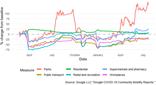 Further increases in mobility were observed compared to the previous week. Overall mobility decreased from half term week (end of May/early June), but has been increasing again since mid-July. The baseline for much of the data is during January to February 2020 and changes are relative to that period. It is not possible to determine if mobility is higher/lower than would have been expected prior to the pandemic as data for 2019 or earlier years is not published.