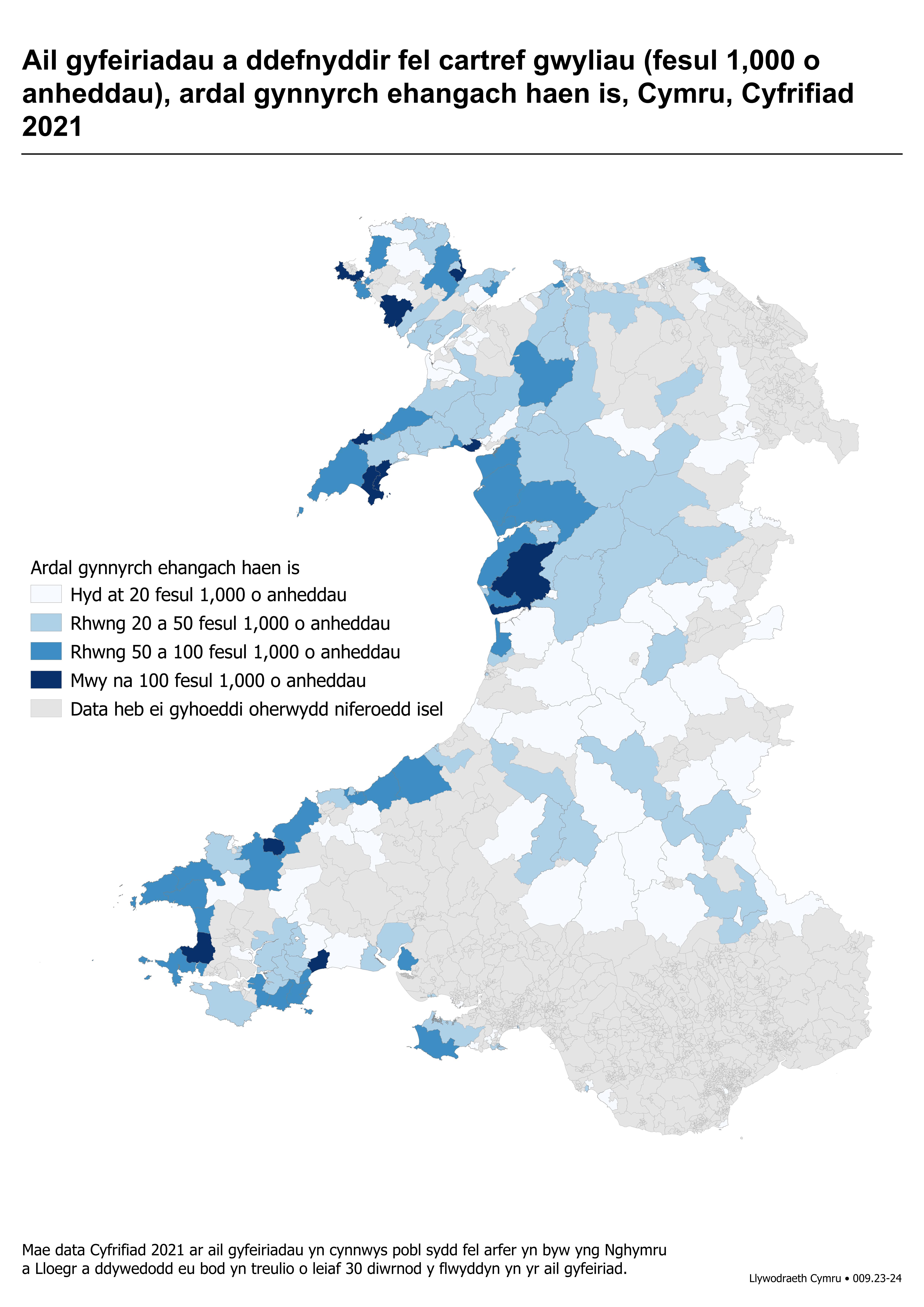 Roedd y gyfradd ar ei huchaf yn Abersoch ac Aberdaron yng Ngwynedd, gyda 153.3 o ail gyfeiriadau yn cael eu defnyddio fel cartrefi gwyliau fesul 1,000 o anheddau. Roedd y gyfradd yn uwch na 50 mewn 13 Ardal Gynnyrch Ehangach Haen Ganol yng Nghymru. Roedd y rhain ar hyd ardaloedd arfordirol yng Ngwynedd, Ynys Môn a Sir Benfro.