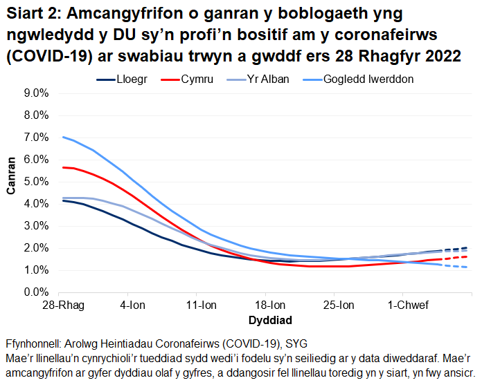 Mae rhywfaint o ansicrwydd o ran yr amcangyfrifon pwynt unigol ar gyfer y gwledydd. Mae’r amcangyfrifon ar gyfer dyddiau diwethaf y gyfres, a ddangosir fel llinellau toredig yn y siart isod, yn fwy ansicr.