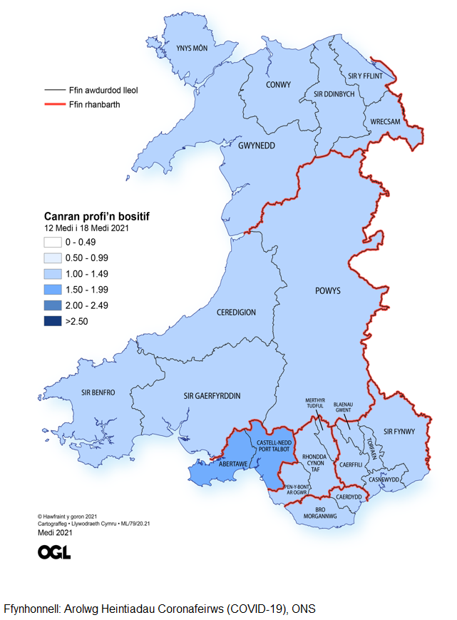 Dadansoddiad o gyfran y bobl sy'n profi'n bositif am COVID-19 ar gyfer 12 i 18 Medi 2021.