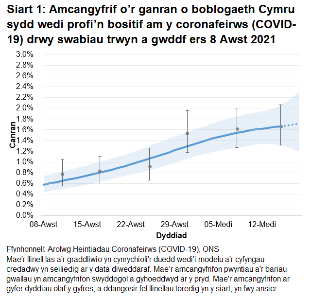 Ar gyfer yr wythnos 12 i 18 Medi 2021 amcangyfrifir bod gan 1.67% o'r boblogaeth gymunedol COVID-19 (cyfwng credadwy o 95%: 1.31% i 2.06%).