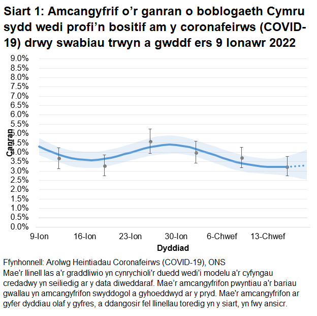 Gan fod yr amcangyfrifon yn seiliedig ar nifer gymharol isel o brofion positif, dylid bod yn ofalus wrth orddehongli unrhyw symudiadau bach yn y duedd ddiweddaraf.