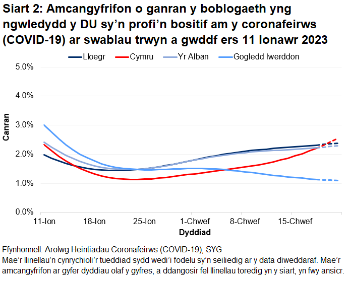 Mae rhywfaint o ansicrwydd o ran yr amcangyfrifon pwynt unigol ar gyfer y gwledydd. Mae’r amcangyfrifon ar gyfer dyddiau diwethaf y gyfres, a ddangosir fel llinellau toredig yn y siart isod, yn fwy ansicr.
