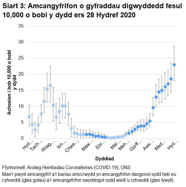 | Cymru | 23.00 o achosion i bob 10,000 o bobl y dydd (18.05 i 28.58) |