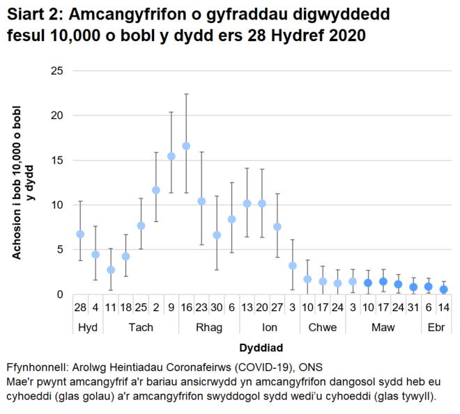 Yng Nghymru, ar gyfer yr wythnos a ddaeth i ben ar 17 Ebrill 2021, rydym yn amcangyfrif bod 0.56 o achosion newydd o brofion positif o’r coronafeirws (COVID-19) fesul 10,000 o bobl y dydd (cyfwng credadwy o 95%: 0.06 i 1.43).