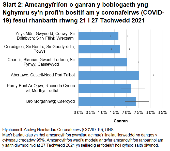 Ymddengys bod cyfraddau o achosion positif ar eu huchaf yn y rhanbarth sy'n cwmpasu Castell Nedd Port Talbot ac Abertawe, er bod y gwahaniaethau rhwng y rhanbarthau yn fach. Mae’r rhanbarthau sy'n cwmpasu Ynys Môn, Gwynedd, Conwy, Sir Ddinbych, Sir y Fflint, Wrecsam a Sir Benfro, Ceredigion, Sir Gaerfyrddin, Powys gyda cyfraddau o achosion positif sydd yn is.