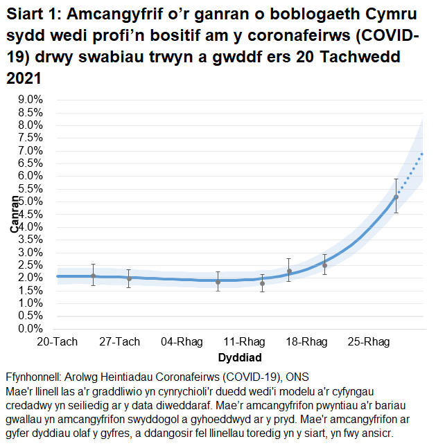 Mae hyn yn gyfwerth â 7,300 o achosion positif newydd yng Nghymru y dydd (cyfwng credadwy o 95%: 5,800 to 8,900).