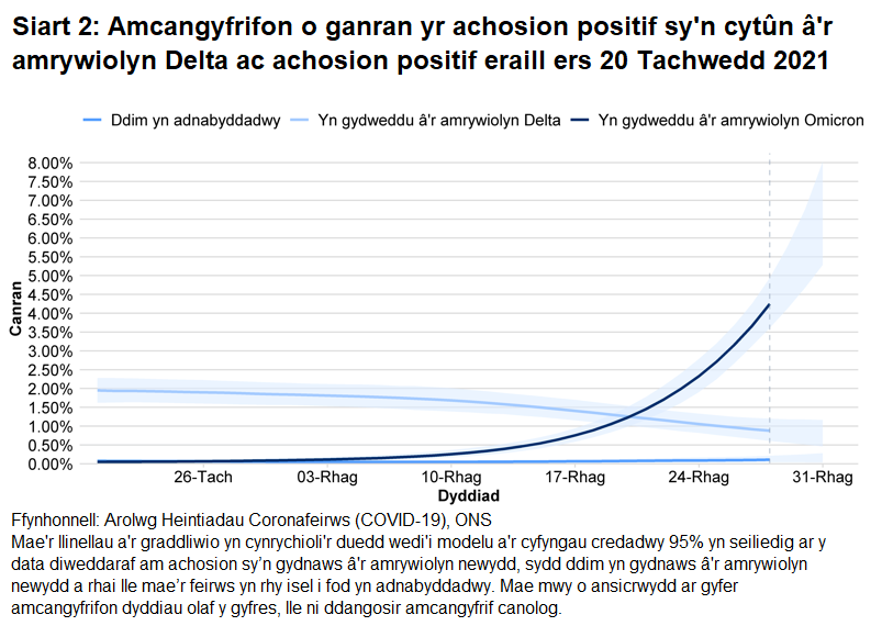 Mae achosion sy'n gydweddu â’r amrywiolyn Omicron wedi cynyddu yng Nghymru yn yr wythnos ddiweddaraf. Mae achosion sy'n gydweddu â’r amrywiolyn Delta wedi gostwng yng Nghymru yn yr wythnos ddiweddaraf. Mae'r achosion lle mae'r firws yn rhy isel i'r amrywiolyn fod yn adnabyddadwy yn isel yn yr wythnos ddiweddaraf.