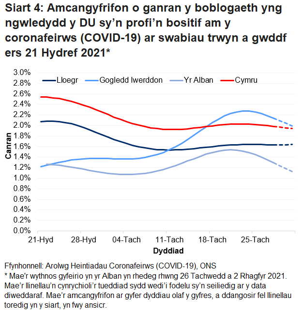 Cynyddodd canran y bobl a brofodd yn bositif yn Lloegr a Gogledd Iwerddon dros y pythefnos diweddaraf ond roedd y duedd yn ansicr dros yr wythnos ddiweddaraf. Gostyngodd canran y bobl a brofodd yn bositif yn yr Alban* yn ystod yr wythnos ddiweddaraf, tra bod y duedd yn parhau i edrych yn sefydlog yng Nghymru dros y tair wythnos diweddaraf.