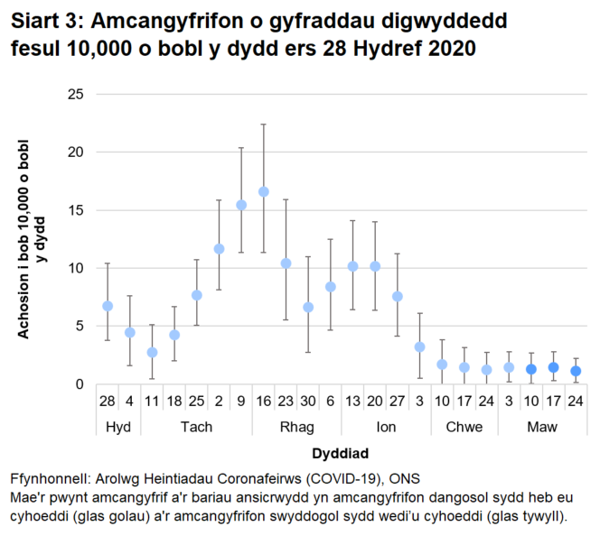 | Cymru | 1.10 o achosion i bob 10,000 o bobl y dydd (0.16 i 2.24) |