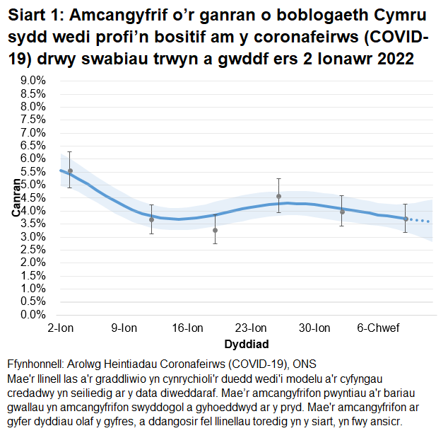 Gan fod yr amcangyfrifon yn seiliedig ar nifer gymharol isel o brofion positif, dylid bod yn ofalus wrth orddehongli unrhyw symudiadau bach yn y duedd ddiweddaraf.