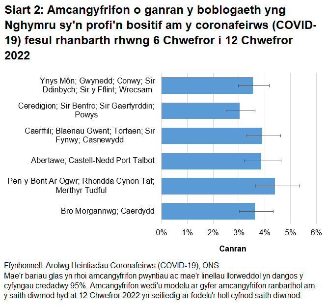Mae angen cymryd gofal wrth gymharu amcangyfrifon rhanbarthol yn erbyn yr amcangyfrif cenedlaethol cyffredinol. Mae'r amcangyfrifon rhanbarthol yn seiliedig ar fodel gwahanol ac ni ddylid eu cymharu â'r amcangyfrif positifedd cenedlaethol. Oherwydd meintiau sampl llai, mae mwy o ansicrwydd mewn amcangyfrifon ar gyfer rhanbarthau unigol, fel y dangosir gan gyfyngau credadwy mwy.