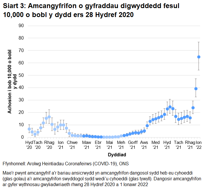 Yng Nghymru, ar gyfer yr wythnos a ddaeth i ben ar 1 Ionawr 2022, amcangyfrifir bod 64.90 o achosion newydd o brofion positif o’r coronafeirws (COVID-19) fesul 10,000 o bobl y dydd (cyfwng credadwy o 95%: 54.29 i 76.90).