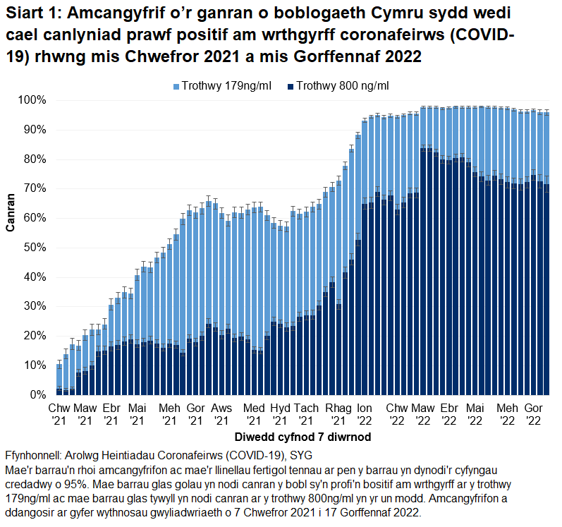 Yn y datganiad hwn, rydym yn adrodd ar ganrannau o'r boblogaeth yr amcangyfrifir bod ganddynt wrthgyrff yn erbyn SARS-CoV-2, y firws penodol sy'n achosi coronafirws (COVID-19) uwchlaw dwy lefel: lefel 179 ng/ml a lefel uwch o 800 ng/ml lefel trothwy. Mae mesur positifrwydd gwrthgyrff ar drothwyon uwch yn galluogi arsylwi gwrthgyrff yn pylu yn gynharach.