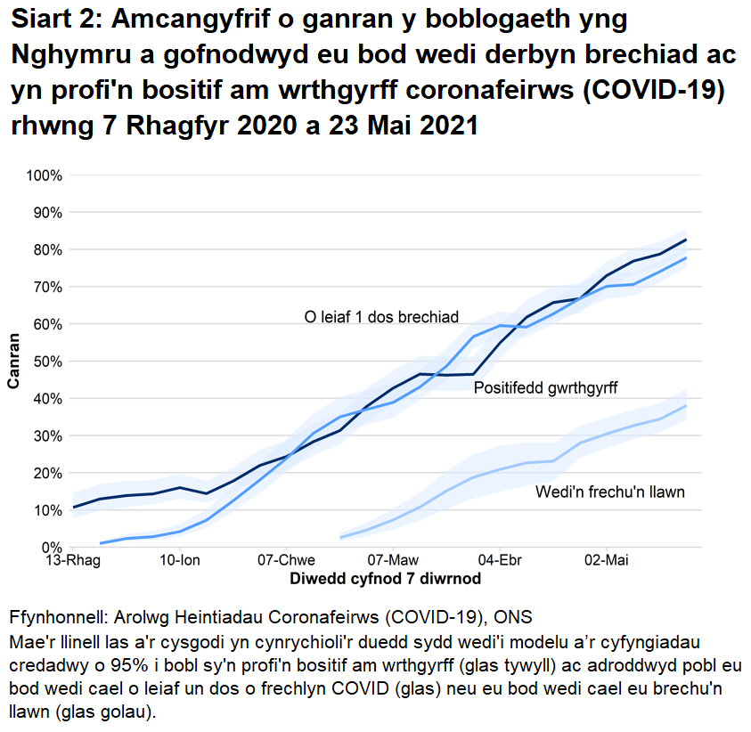 Mae’r cyhoeddiad hwn hefyd yn cyflwyno amcangyfrifon yn seiliedig ar bobl yn hunanadrodd, mewn perthynas â’r ganran ohonynt sydd wedi cael un dos neu fwy o frechlyn COVID-19 ers 14 Rhagfyr 2020 ac amcangyfrifon o ganran y bobl yr adroddwyd eu bod wedi’u brechu’n llawn ers 15 Chwefror 2021. Mae’r amcangyfrifon hyn yn defnyddio modelu sy’n seiliedig ar y bobl yr ymwelwyd â nhw yn yr Arolwg Heintiadau COVID-19 a gynhaliwyd yn y gymuned am gyfnod penodol o amser. Mae’r amcangyfrifon wedyn yn cael eu haddasu i adlewyrchu’r boblogaeth.