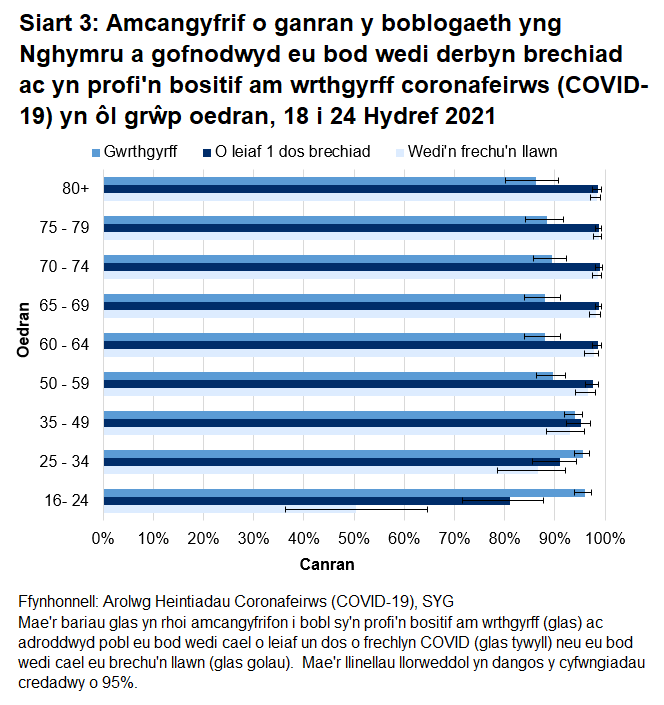 Mae canran y bobl sy'n profi'n bositif am wrthgyrff yn parhau i fod yn uchel mewn pob grŵp oedran ac er gwaetha’r gostyngiad bach yn y grwpiau oedran hŷn (y rhai 65 oed a hŷn) ers diwedd Gorffennaf 2021 mae’r canran wedi aros yn uchel yn y mis diwethaf gyda’r amcangyfrifon yn amrywio o 86.3% i 89.4% ar gyfer pobl dros 65 oed yn yr wythnos 18 i 24 Hydref. Mewn cyferbyniad, cynyddodd cyfraddau positifrwydd gwrthgyrff i 96.0% ar gyfer y rhai rhwng 16 a 24 oed.
