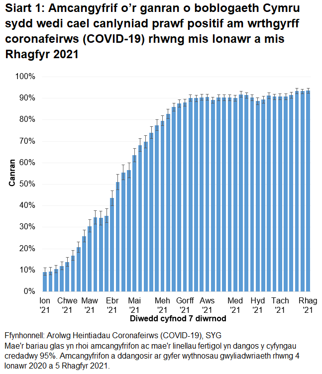Cyfran y bobl yng Nghymru a gafodd gwrthgyrff yn erbyn COVID-19