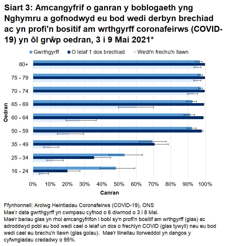 Rhwng 3 a 9 Mai, adroddwyd bod 73.0% o bobl 16 oed a hŷn wedi cael un dos neu fwy o frechlyn COVID-19 (cyfwng credadwy 95%: 69.9% i 76.7%), gyda bron i draean yn adrodd eu bod wedi cael eu brechu’n llawn.