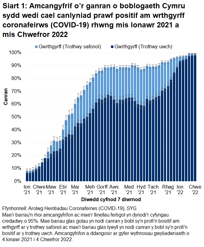 Rhwng 31 Ionawr a 4 Chwefror 2022, amcangrifir bod dros 9 o bob 10 person (99.4%) o bobl 16 oed a hŷn wedi cael canlyniad prawf positif am wrthgyrff coronafeirws (COVID-19) yn seiliedig ar y trothwy safonol (cyfwng credadwy o 95%: : 99.0% to 99.6%). Ar y trothwy uwch, amcangyfrifir bod dros 9 o bob 10 o bobl (97.9%) 16 oed a hŷn wedi profi’n bositif am wrthgyrff (cyfwng credadwy 95%: 97.4% to 98.3%).