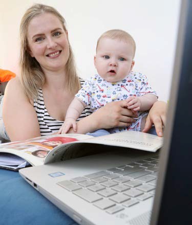 Mae Kathryn Adams, cynghorydd dysgu a datblygu yng Ngholeg Penybont, yn dal i fyny â gwaith ar-lein yn gyflym iawn tra’n gofalu am Oscar y babi.