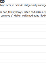 Os oes angen fersiwn fwy hygyrch o’r ddogfen hon arnoch, e-bostiwch digidol@llyw.cymru. Dywedwch wrthym pa fformat sydd ei angen. Os ydych yn defnyddio technoleg gynorthwyol, nodwch fanylion.