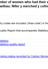 Nifer y merched y cofnodwyd eu statws ysmygu trwy fonitro Carbon Monocsid adeg yr asesiad cychwynnol a’r enedigaeth, 2016 i 2024 , Saesneg yn unig, math o ffeil: ODS, maint ffeil: 44 KB