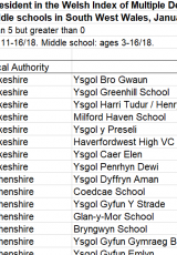 - Disgyblion yn y 40% o ardaloedd mwyaf difreintiedig (Safleoedd MALlC 2014) fesul ysgol yn ne orllewin Cymru, 2020