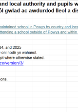 - Disgyblion sy'n mynychu ysgol ym Mhowys yn ôl gwlad ac awdurdod lleol a disgyblion â chod post cartref ym Mhowys ac yng Nghymru sy'n mynychu ysgol mewn awdurdod lleol arall, 2023 i 2025