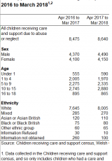 Demograffeg plant sy'n derbyn gofal a chymorth oherwydd cam-drin neu esgeulustod, Ebrill 2016 i Fawrth 2018 , Saesneg yn unig, math o ffeil: ODS, maint ffeil: 15 KB