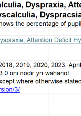 - Canran y disgyblion ym Mhowys gyda Dyslecsia, Dyscalculia, Dyspracsia, Anhwylder diffyg canolbwyntio a gorfywiogrwydd, neu Anhwylderau ar y sbectrwm awtistig, 2017 i 2023